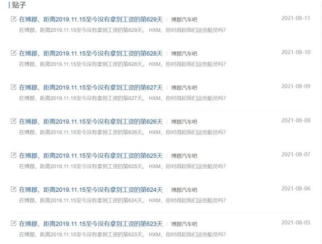 在百度贴吧,有一位吧龄11年的用户发布了只有一个主题的帖子《在博郡,距离2019.11.15至今没有拿到工资的第XXX天》,在今年的8月11日,也就是博郡汽车欠他工资的第629天,他终于没有耐心更新下去,选择了无声告别。