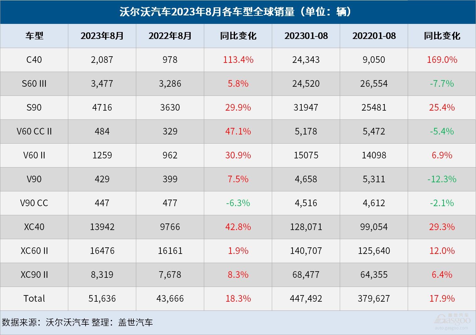 有车部落讯 根据沃尔沃汽车9月4日发布的新闻稿,随着在欧美市场的销量大幅增长,沃尔沃汽车8月份在全球的销量同比增长18%,达到51,636辆。1月至8月,沃尔沃汽车共售出了447,492辆汽车,同比增长18%。