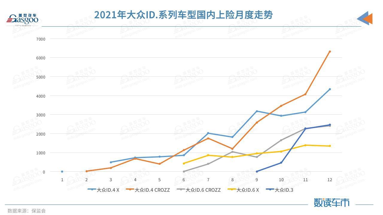 过去一年,大众ID.系列车型扩容,在大众ID.4 CROZZ、ID.4X基础上,2021年大众在中国还推出了ID.6 CROZZ、ID.6X、ID.3等车型,其中ID.4 CROZZ、ID.4X全年上险分别达到2.1、2.0万辆,后三款车型上险仍处爬坡状态,单车型全年上险均未过万。