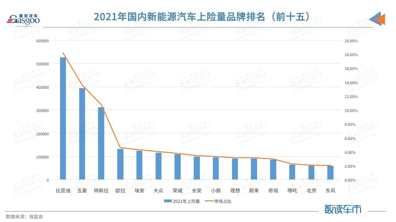 2021年新能源汽车市场中,自主品牌可谓是冲劲最大的。数据显示,国内全年新能源市场按照品牌上险量排名,前十五个品牌累计上险占据约81%的市场份额,而这其中除特斯拉以外均为自主品牌。