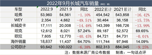 与此同时,在核心板块里经历的“阵痛”里也藏着销售结构优化的“喜”。在长城9月份的销量数据里,明确提到,高价值、智能电动化产品的销售占比正在不断提升,20万元以上车型销量占比提升至15.68%;新能源车型销售10,368辆,占比11.07%。