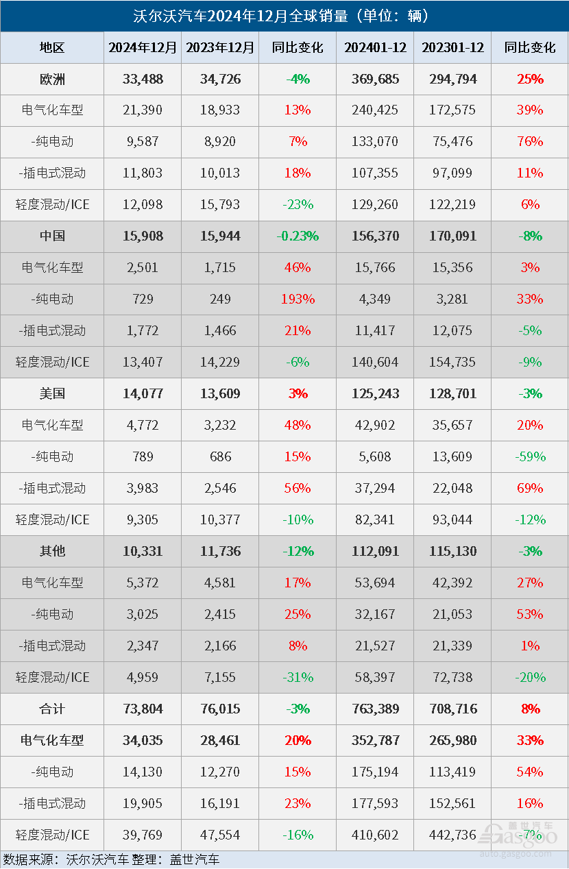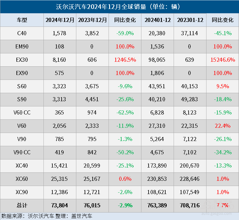 有车部落讯 1月7日,沃尔沃汽车公布,尽管2024年12月,其全球销量同比下降3%至73,804辆,但2024年,其全球销量仍同比增长8%至763,389辆,创新高。
