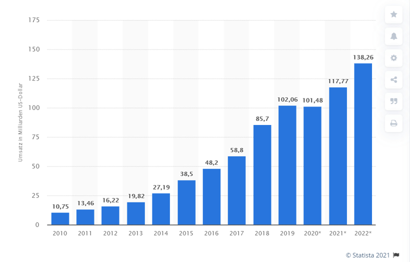 图1 全球企业SaaS市场营业额分布及预测(单位十亿美元,德国Statista)