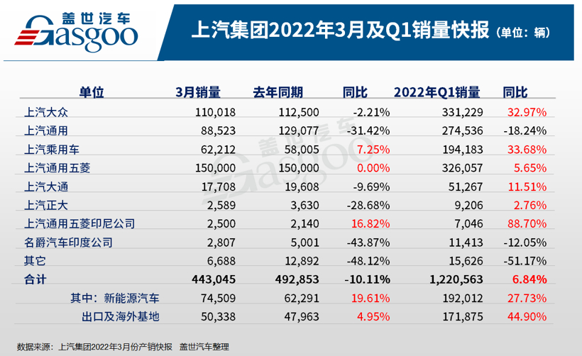 日前,上汽集团公布了2022年3月产销快报。数据显示,其3月整车销量为44.3万辆,同比下滑10.1%。随着3月销量数据的出炉,上汽集团今年一季度销量也浮出水面,其一季度销量为122万辆,同比增长6.8%。
