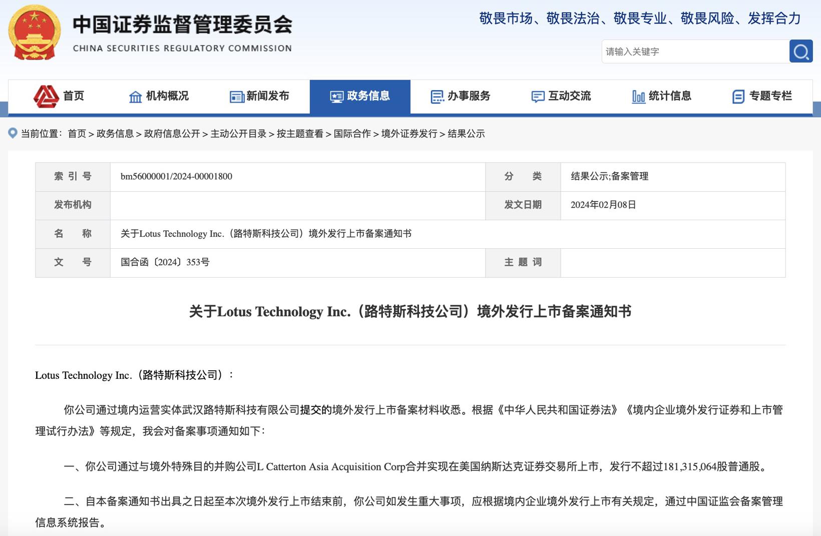 此外,中国证监会也在2月初披露了关于Lotus Technology Inc.(路特斯科技公司)境外发行上市备案通知书。通知书显示,路特斯科技将通过与境外特殊目的并购公司L Catterton Asia Acquisition Corp合并实现在美国纳斯达克证券交易所上市,发行不超过181,315,064股普通股。