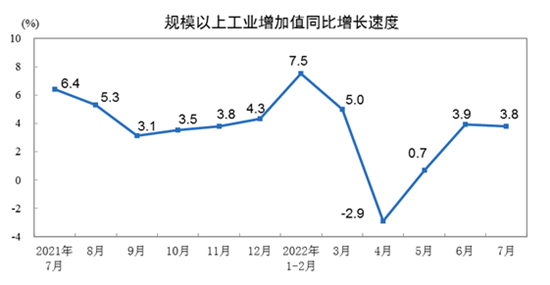 今日,国家统计局发布数据显示,7月,全国规模以上工业增加值环比增长0.38%,同比增幅相比上月回落0.1个百分点至3.8%。1-7月,全国规模以上工业增加值同比增长3.5%,比1-6月加快0.1个百分点。