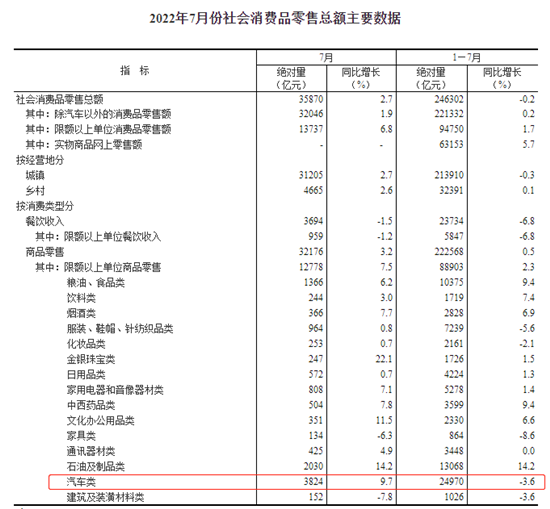 聚焦汽车类消费,7月,汽车类消费总额为3824亿元,同比上升9.7%;1-7月,汽车消费总额达到24970亿元,同比下滑3.6%。