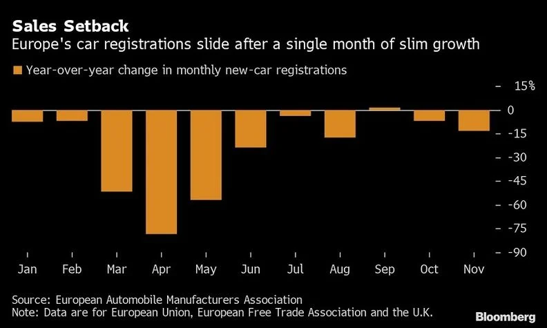 截至11月底,今年欧洲车市销量已损失380万辆。据彭博预计,今年欧洲汽车销量将下跌25%。这些数字预示着,即使新冠疫苗即将研发成功的消息提振了市场的乐观情绪,但汽车制造商仍要面临一个艰难的冬天。