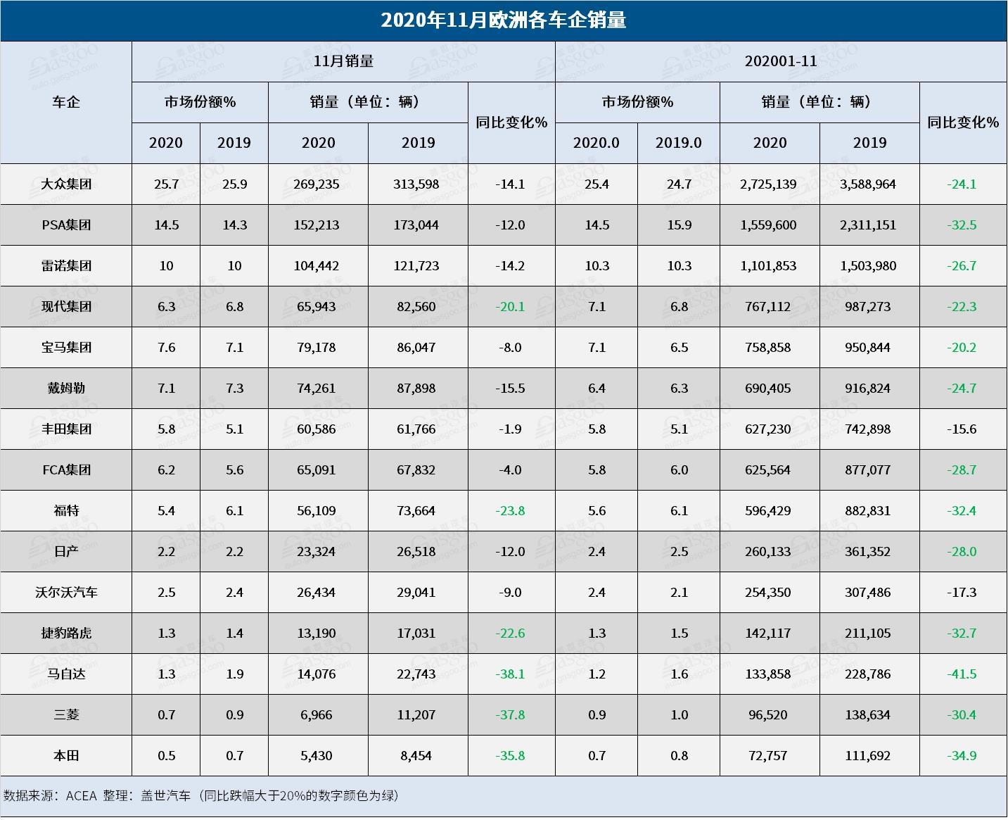 今年1月至11月,欧洲乘用车市场缩水26.1%,至10,746,293辆,同比减少了300多万辆。今年以来,疫情持续对欧洲车市产生重创,西班牙累计销量跌幅最惨,同比下降35.3%;英国同比下降30.7%,意大利同比下降29%,法国同比下降26.9%,德国同比下降21.6%。