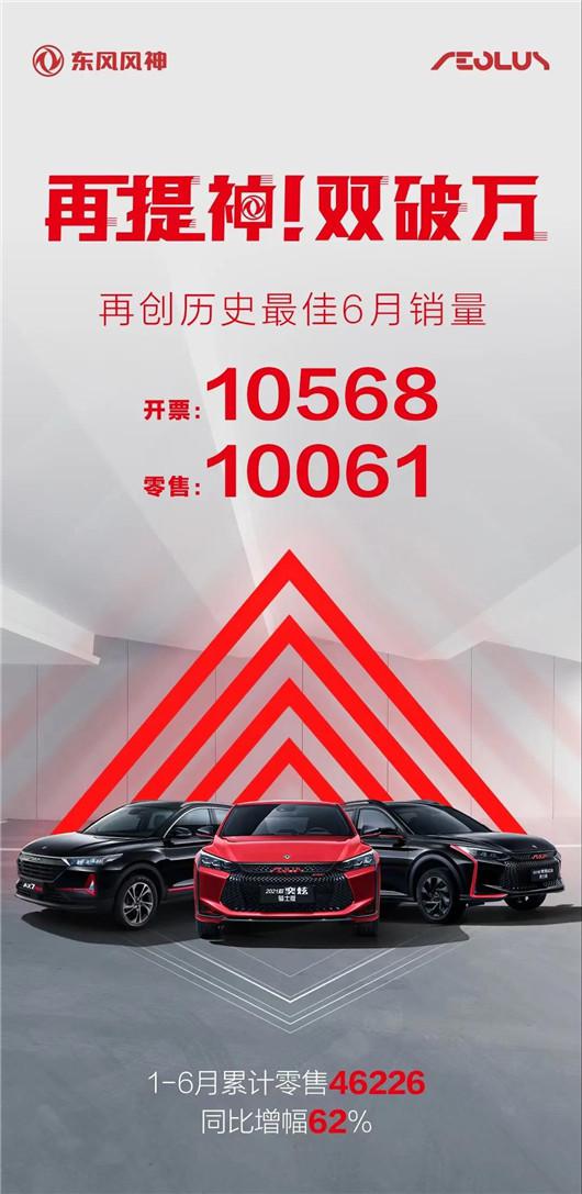 7月1日,根据东风风神官方消息,东风风神6月份再次以开票10568辆,零售10061辆的“双破万”销量成绩,创造了风神史上的“最佳6月”战绩,同时其5月销量破万,超出历史同期最高值20%。截至6月,东风风神今年累计零售达到46226辆,同比增幅达到62%。