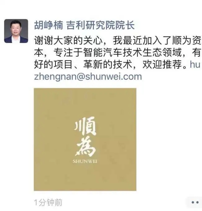近日,吉利汽车研究院院长胡峥楠在朋友圈公布,其已加入顺为资本。该机构是雷军和许达来在 2012 年创办的风投机构,胡峥楠担任投资合伙人。除了公布最新状态外,胡峥楠还顺便打了个广告“有好的项目、革新的技术,欢迎推荐。”