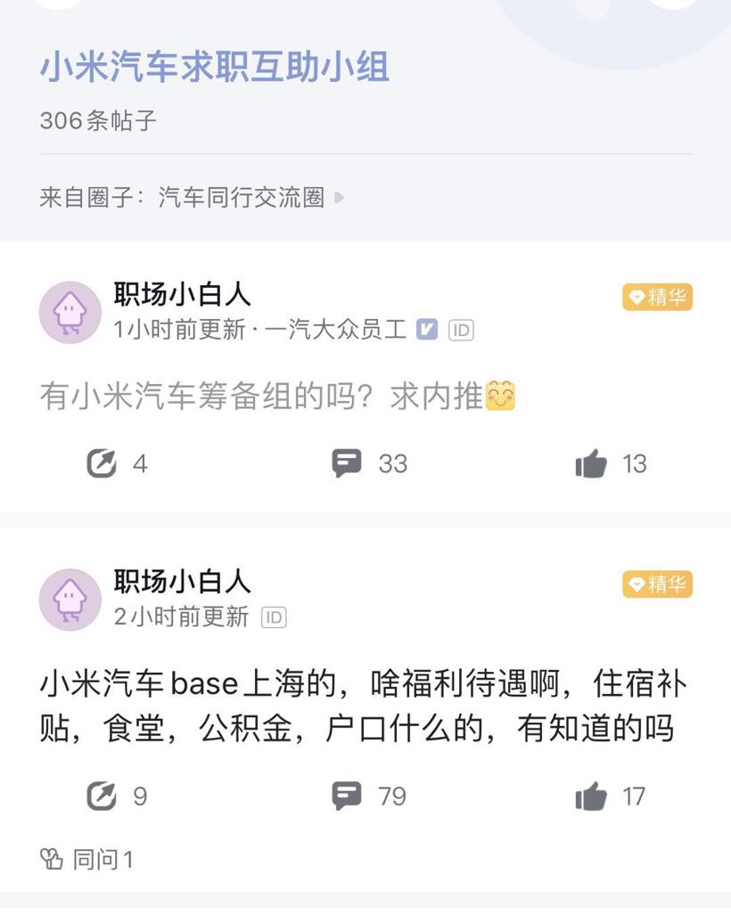 小米汽车正式宣布成立不到一周,在某职场社交平台上,“小米汽车求职互助小组”里已经有超过300条讨论的帖子。伴随小米汽车在北京正式落户的消息,内推、面试、投递简历成为该小组近期讨论的热点话题。
