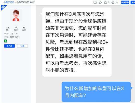 对此,有网友在论坛发帖表示,2021年10月底签订的合同目前仍未提车,客服反而推荐其购买2月14日新上市的460+及510车型,并表示2月23日前改配成功,预计3月31日前优先配车。该客户质疑到,“去年10月份的订单不给交付,为什么新增加的车型可以在3月内配车?”