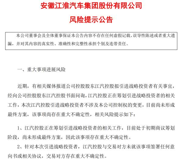 昨日午间,针对外媒报道大众汽车收购其股权一事,安徽江淮汽车集团股份有限公司发布风险提示,称江汽控股正在筹划引进战略投资者的相关工作,目前处于初期商议筹划阶段,尚未形成最终方案,因此该事项存在重大不确定性。