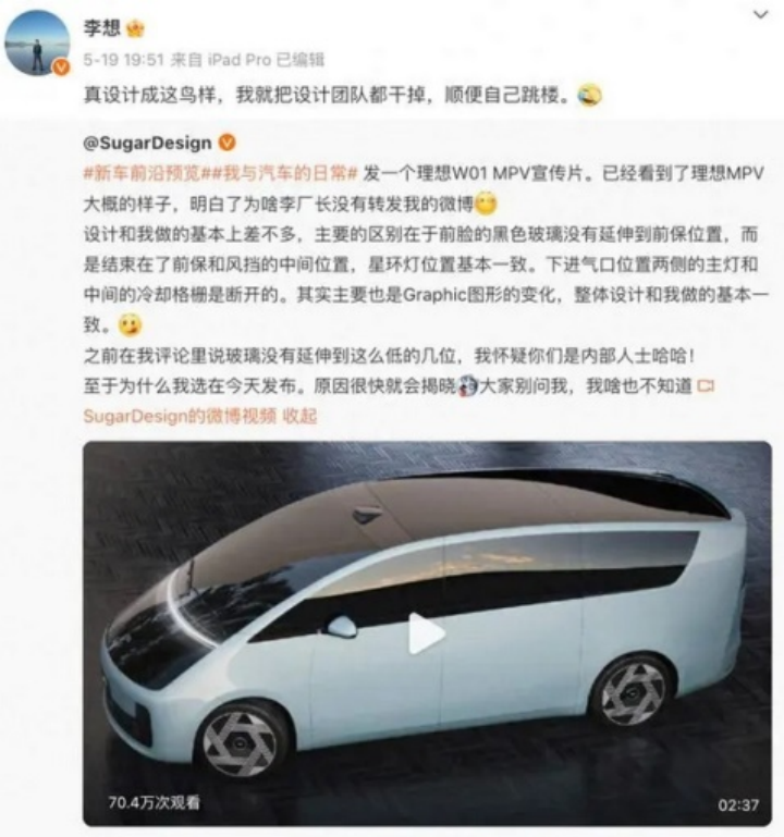 以理想Mega的传播为例,李想先是在微博上吐槽某网友自制的渲染图:“真设计成这鸟样,我就把设计团队都干掉,顺便自己跳楼”。然而,之后其本人发布的理想MEGA公开设计图却跟渲染图高度相似,由此激发一众讨论,甚至有好事者制作了各种PS图,最终李想“兑现承诺”,在微博上发布一段AI换脸跳楼视频,并表示“是MindGPT逼我的……”。一次次话题制造,让大家了解了理想又出了一款造型独特的MPV,仅这几条微博就已经值多少条广告的效果了。