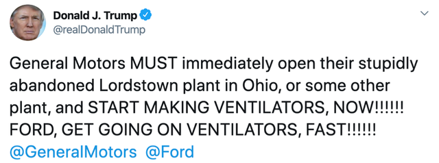 日前,美国总统特朗普动用了《国防生产法》授予的权力,要求通用、福特投入到呼吸机的生产中。而不久前,其还在社交媒体上对通用汽车疾声催促:“通用汽车公司必须立即在俄亥俄州的洛德斯敦重开他们那被愚蠢抛弃的工厂,或者其他什么工厂。总之必须开始制造呼吸机,马上!”同时还喊话福特:“福特,开动做呼吸机,快!!!!!”