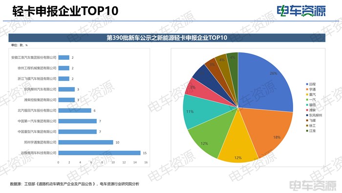 从申报的企业来看,本次共有15家企业申报新能源轻卡车型,较上期增长明显。本期远程申报最多,共申报15款车型;第二是宇通,本期共申报10款;第三是重汽,本期共申报7款。