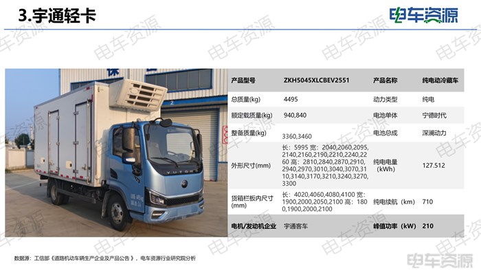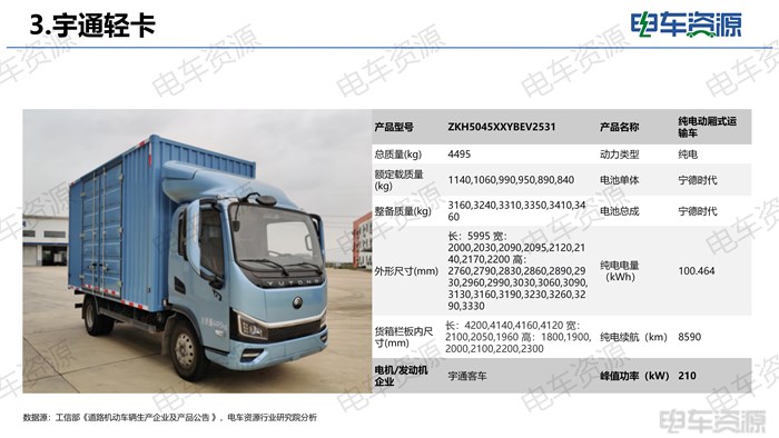 本期宇通汽车共申报10款新车,全部为纯电动,均搭载宁德时代电池。包含1款载货车,2款仓栅运输车,2款厢式运输车,3款冷藏车,2款底盘。ZKH1047P1BEV256(栏板)、ZKH5045CCYBEV2561(仓栅)、ZKH5045XXYBEV2561(厢式)三款车型搭载深澜动力 155.332 kWh磷酸铁锂电池,单体来自宁德时代,工况续航 820 公里;ZKH5045XLCBEV2551(冷藏)车型搭载深澜动力 127.512 kWh磷酸铁锂电池,单体来自宁德时代,工况续航 710公里;ZKH5045CCYBEV2531(仓栅)、ZKH5045XXYBEV2531(厢式)两款款车型搭载深澜动力 100.464 kWh磷酸铁锂电池,单体来自宁德时代,工况续航 590 公里。