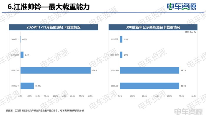 从公示车型的额定载重来看,额定载重主要集中在1000kg以下、1000-1500kg区间,江淮帅铃以2125kg的额定载重获得冠军,潍柴蓝擎根据不同车型额定载重区间为1300-1635kg,排第二。