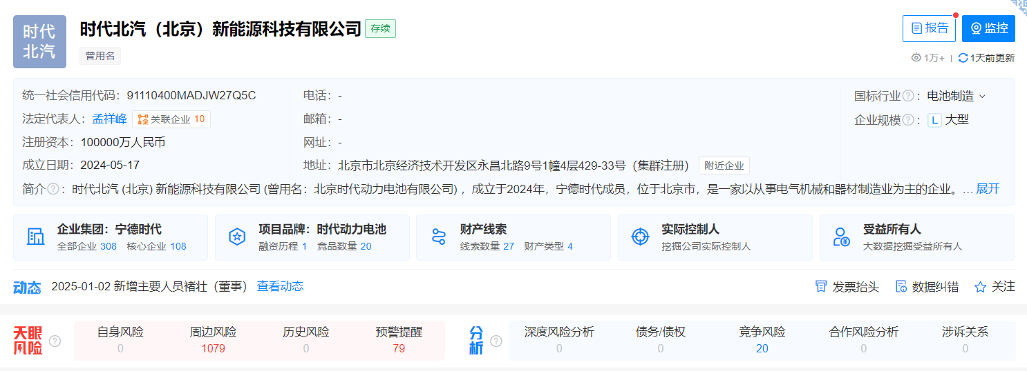 1月3日消息,据天眼查显示,北京时代动力电池有限公司于近日发生工商变更,企业名称变更为“时代北汽(北京)新能源科技有限公司”,经营范围新增技术服务、技术开发、技术咨询、技术交流、技术转让、技术推广,电池销售,货物进出口,同时,该公司的部分主要人员也发生变更。