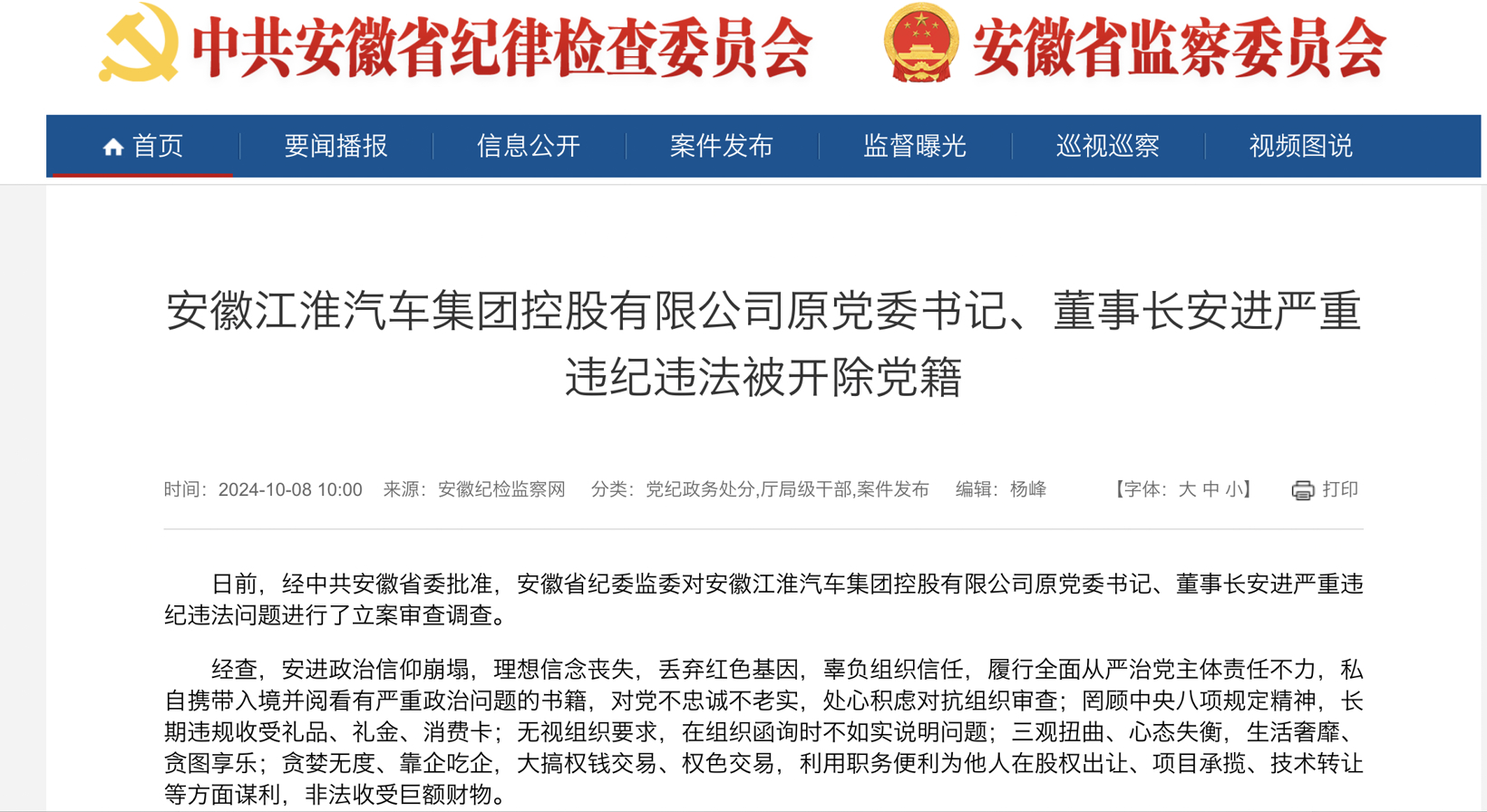 10月8日,安徽纪检监察网发布,安徽省纪委监委对安徽江淮汽车集团控股有限公司原党委书记、董事长安进因严重违纪违法被开除党籍。