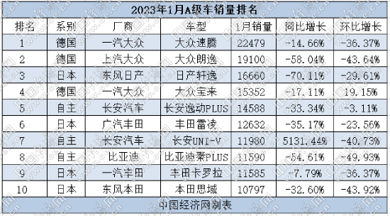 2023年首月,汽车市场未能迎来“开门红”,A级车市场更是首当其冲。乘联会数据显示,1月A级车累计销售28.7万辆,同比下降46.2%,跌幅高于乘用车整体。除长安UNI-V之外,前十车型同比均出现不同程度的下滑。分国别来看,日系品牌占据前十榜单的四席;德系和自主品牌平分秋色,分别占据三席。